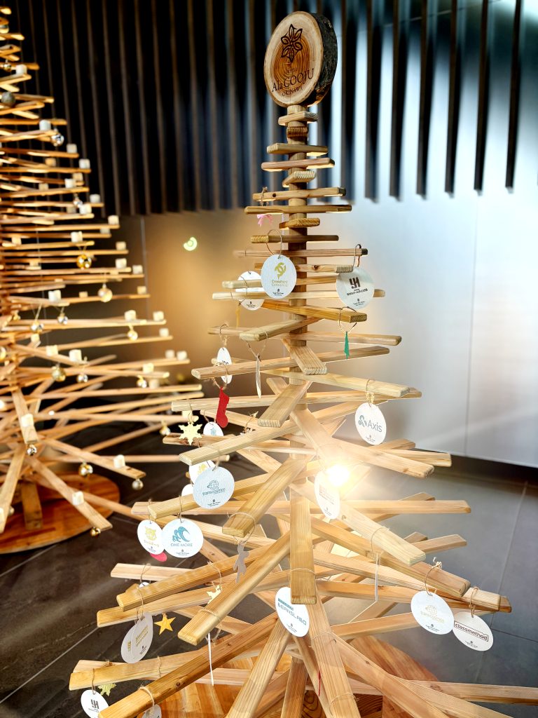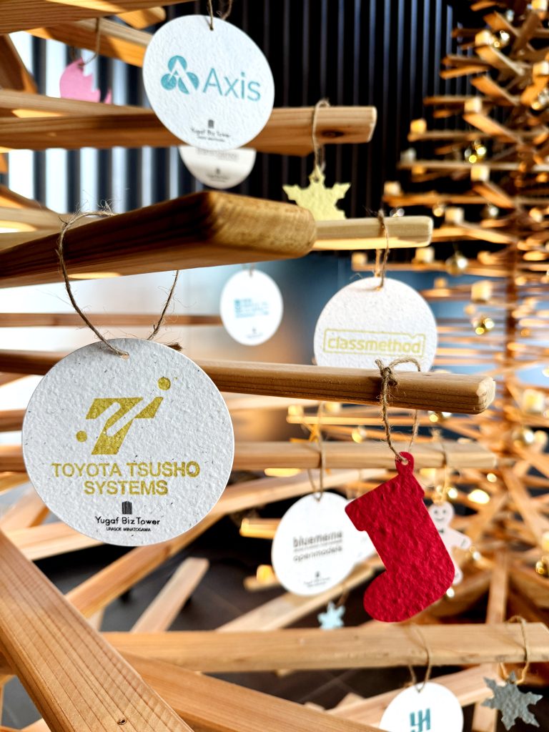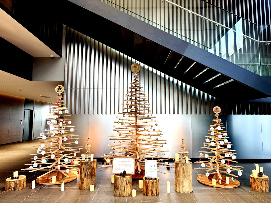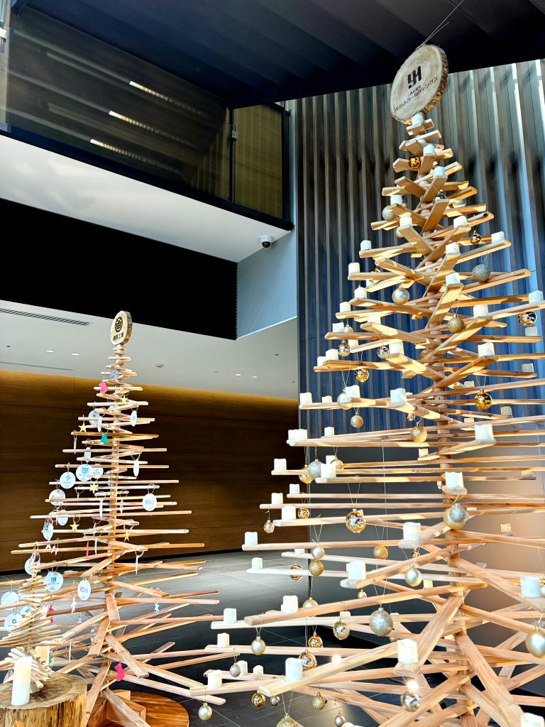 お越しの際は、ぜひ足を止めて、サステナブルな間伐材ツリーの温もりをご体感ください。