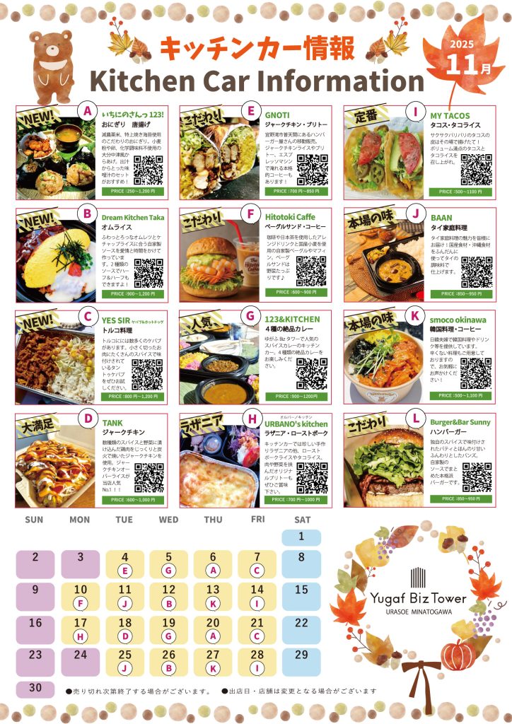 キッチンカー INFORMATION 11月号 来月も充実のラインナップで、皆さまのお越しをお待ちしております。 また「このキッチンカーに来てほしい」などのリクエストも随時受け付けております。 11月も楽しいランチタイムをお過ごしください。 前のページに戻る