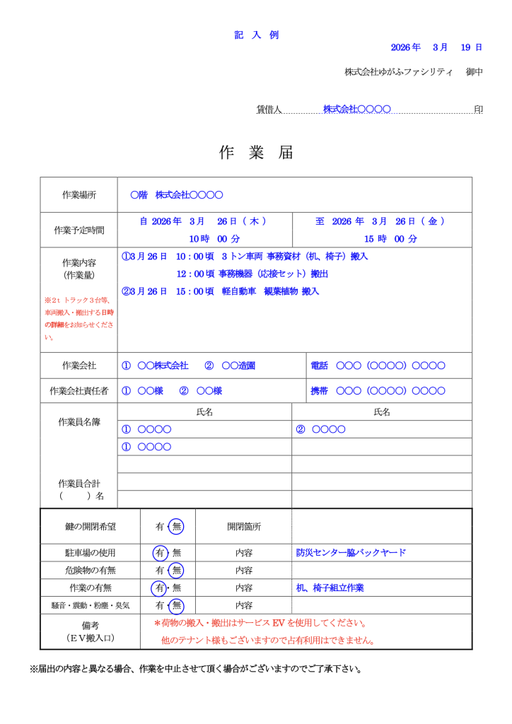 つきましては、新しい作業届の書式および記入例を添付いたしますので、