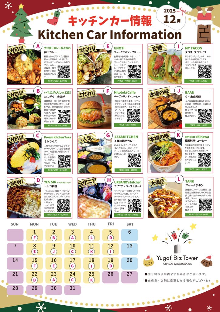 ゆがふBizタワー浦添港川では、ランチタイムにキッチンカーの出店を行っております。12月はカレーの激戦区、東京の神田で開催された「神田カレーグランプリ」で優勝した「カリガリカレー」の沖縄店が初出店!日本人好みのジャパニーズカレーの真髄をご堪能ください。 さらにレギュラーメンバーのキッチンカーも、ここにいながら世界の味覚を楽しめるバラエティ豊かなメニューをご用意! 日替わりで様々なメニューをご提供しておりますので、ぜひご賞味ください!